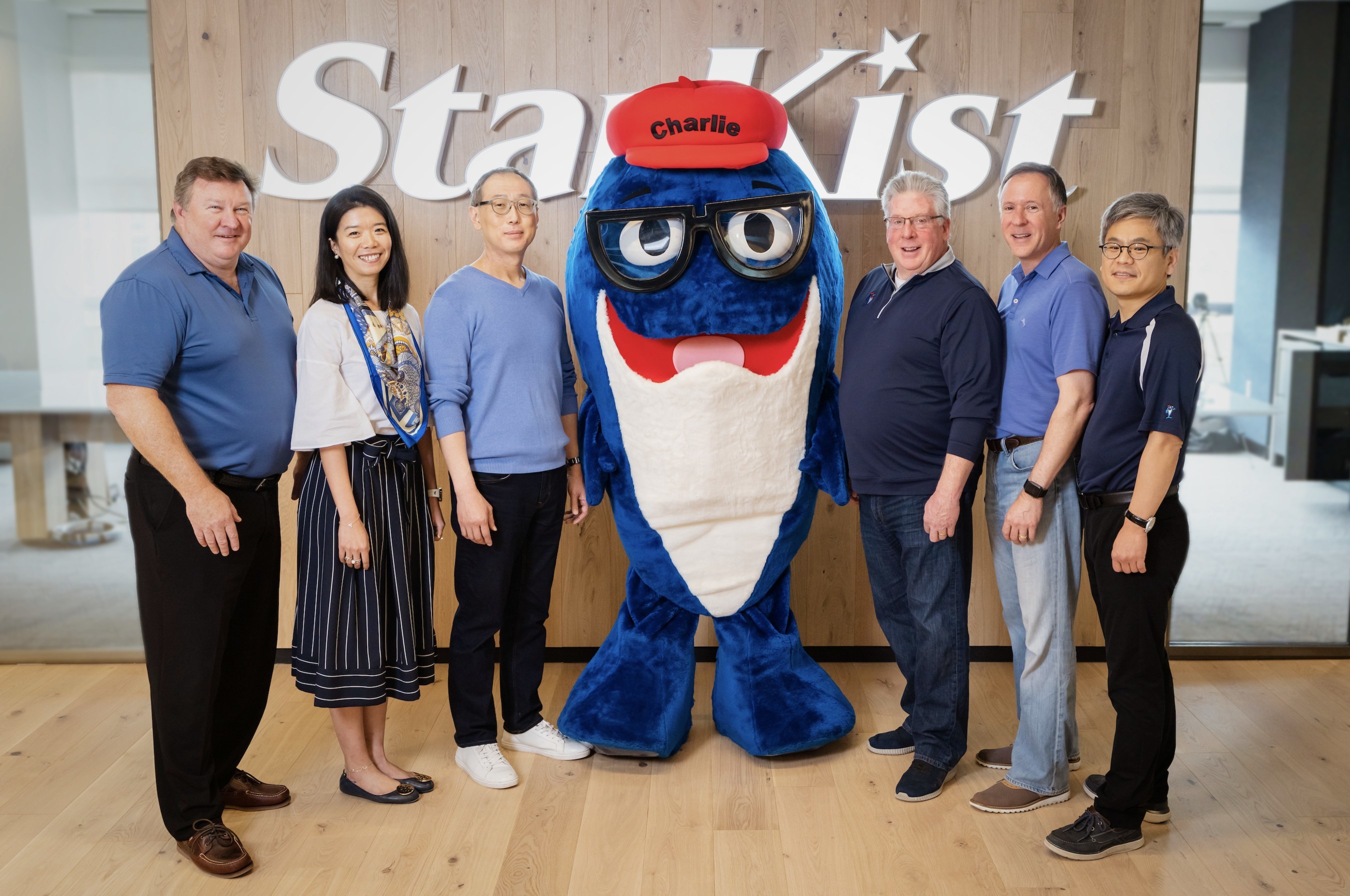 El equipo directivo de Charlie the Tuna®, compuesto por (de derecha a izquierda) Scott Meece, vicepresidente sénior de Asesoría Jurídica; Melody Ge, directora de Control de Calidad; Andrew Choe, presidente y director ejecutivo; Charlie the Tuna®, portavoz de StarKist; Earl Moynihan, vicepresidente de Cadena de Suministro; John Casten, vicepresidente de Ventas; Jung Ro Ki, vicepresidente sénior y director de Finanzas; crédito de la fotografía: Anfon Ha