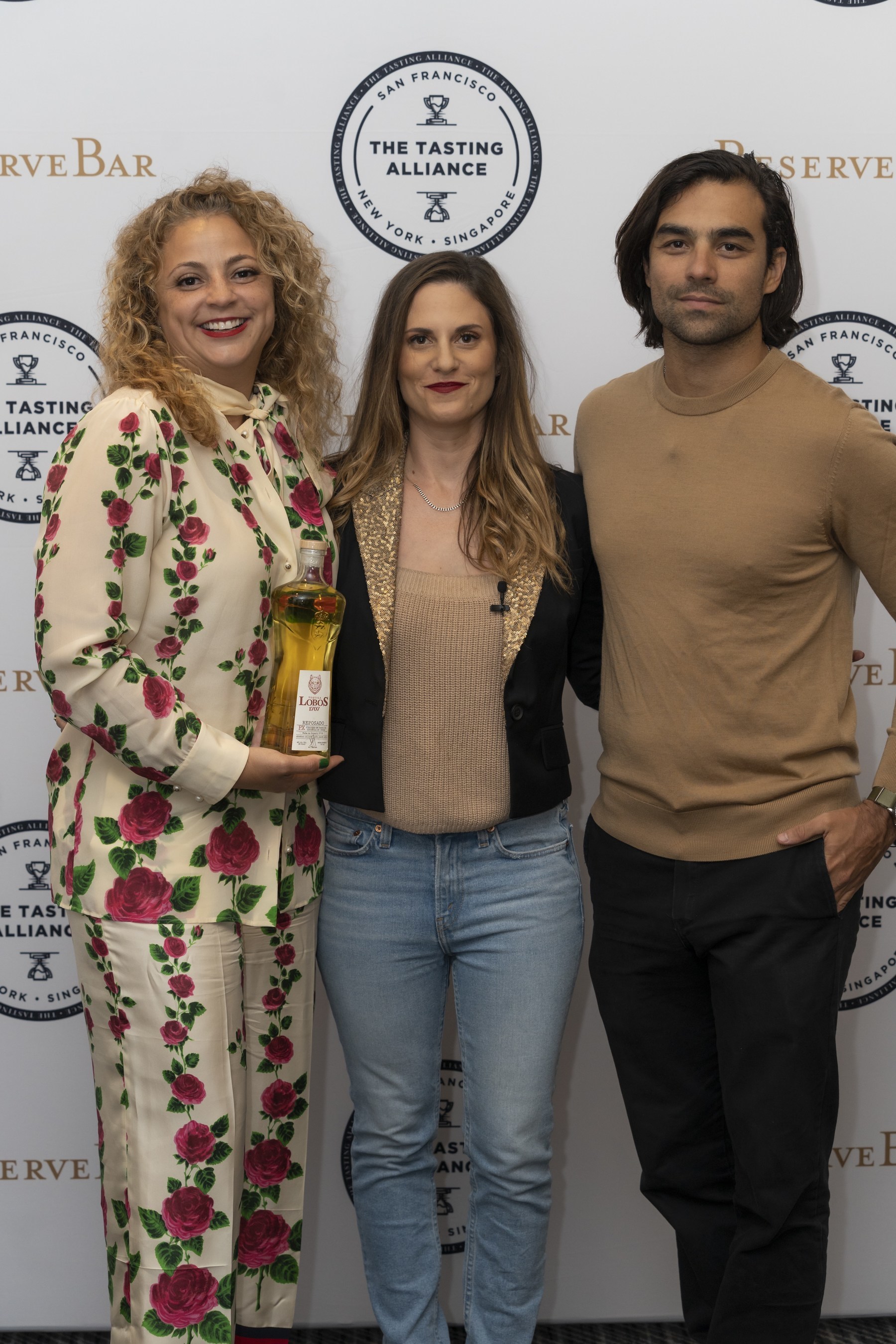 (I-D) Erin Harris, directora de marca de Lobos& 1707, Amanda Blue, directora de operaciones de Tasting Alliance, y Diego Osorio, fundador y director creativo de Lobos& 1707 en la San Francisco World Spirits Competition& 2022